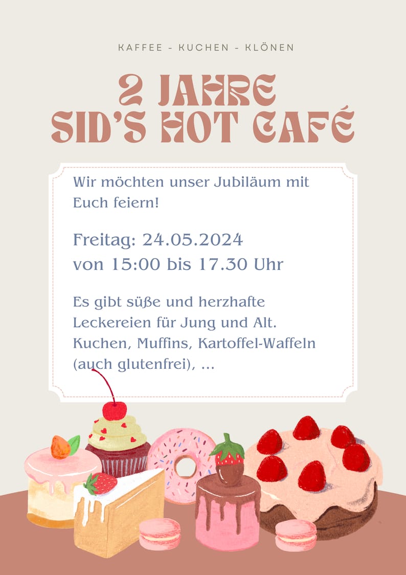 Veröffentlicht am 22.05.2024 von mmeis24.5.2024 Sid’s HOT Café – 2 Jahre Uns gibt es nun schon seit 2 Jahren! 🍰☕🥧Das wollen wir Freitag mit Euch feiern! Kommt vorbei!