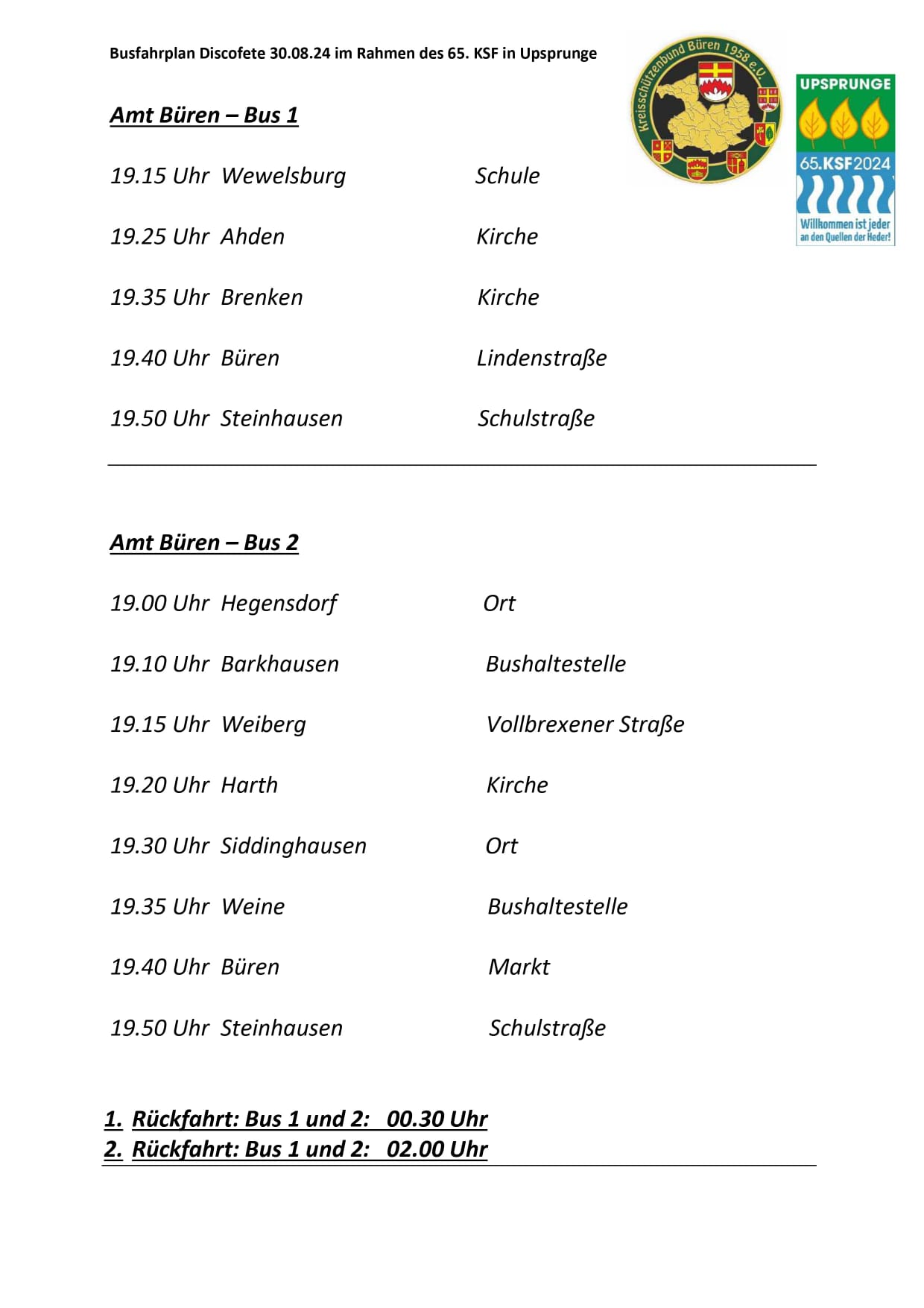 Veröffentlicht am 16.08.2024 von mmeis30.8.2024 Busfahrplan für Discofete Kreisschützenfest Upsprunge