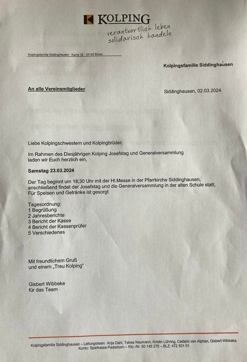Herzliche Einladung an alle Kolpingmitglieder zur Jahresversammlung am 15.03.2025.