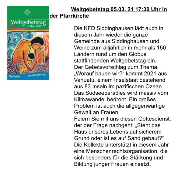 Wir freuen uns sehr über die große Anzahl von Gottesdienstbesuchern an jedem Wochenende. Es ist schön, dass wir so in Gemeinschaft den Glauben feiern können. Da die Zahl der Kirchenbesucher in der Kirche weiterhin noch stark eingeschränkt ist und sicherlich auch noch einige Zeit so bleiben muss, werden wir in den kommenden Wochen, sofern es das Wetter zulässt, verstärkt wieder Gottesdienste auf dem Kirchplatz anbieten. Hierüber informieren wir jeweils über Sid.