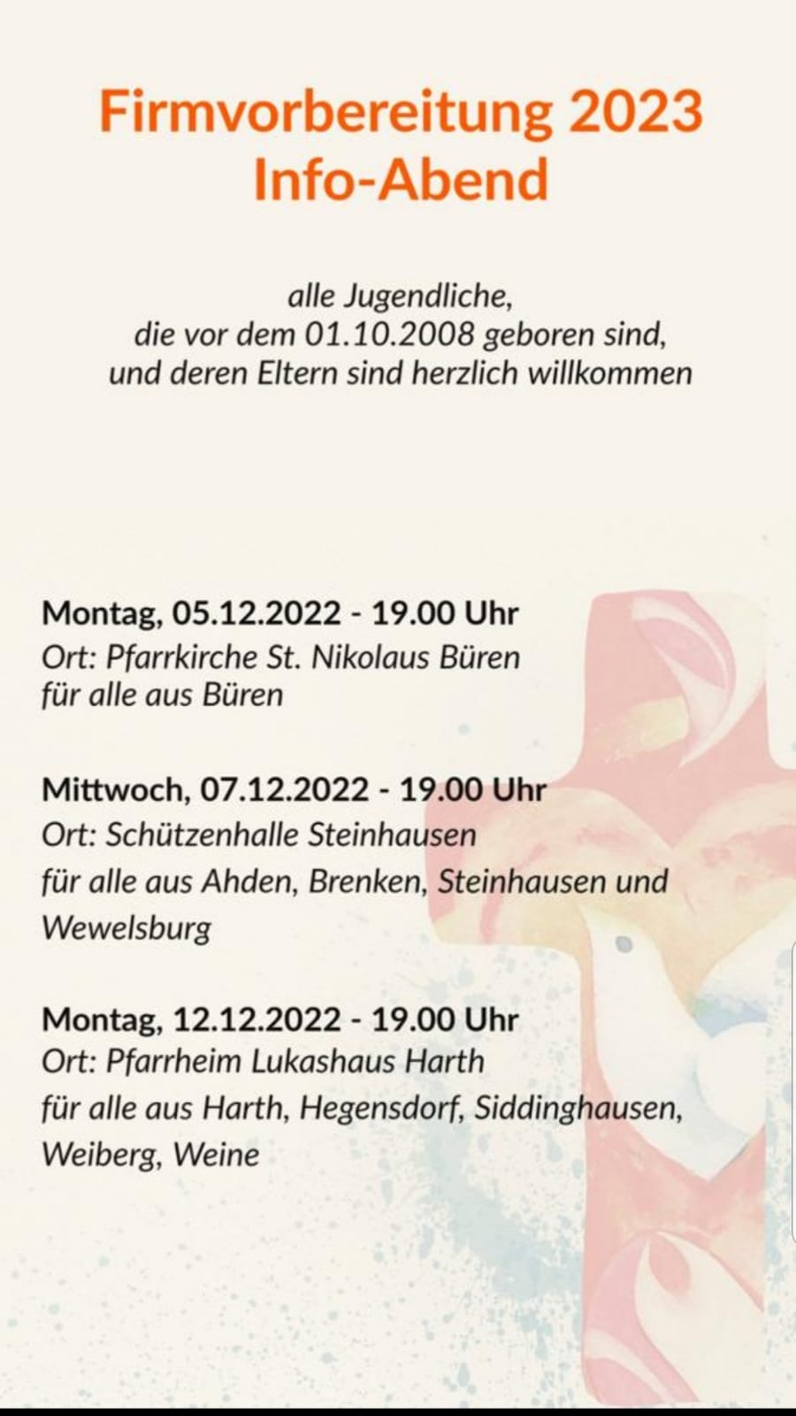 Der Info-Abend zur kommenden Firmenvorbereitung findet für die SiddinghäuserInnen auf der Harth statt.