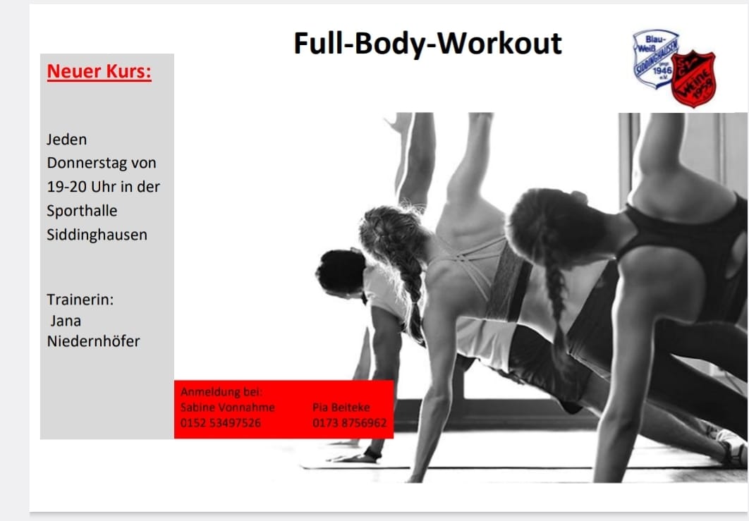 Ab dem 24.8.23 startet ein „Full-Body-Kurs“ für Jedermann. Donnerstags von 19-20 Uhr bringt euch Jana Niedernhöfer beim Full-Body Workout ins Schwitzen. Der Kurs findet in der Sporthalle Siddinghausen statt💪